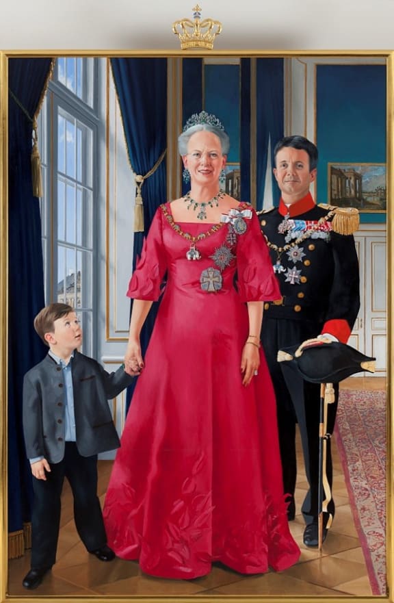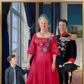 Group portrait of HM Queen Margrethe II, her son crown prince Frederick and his eldest son Christian commissioned to the museum at the occasion of the Queens 40th jubilee as a Danish ruler in 2012. By Niels Stroebek .