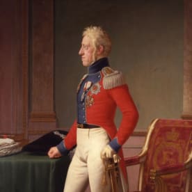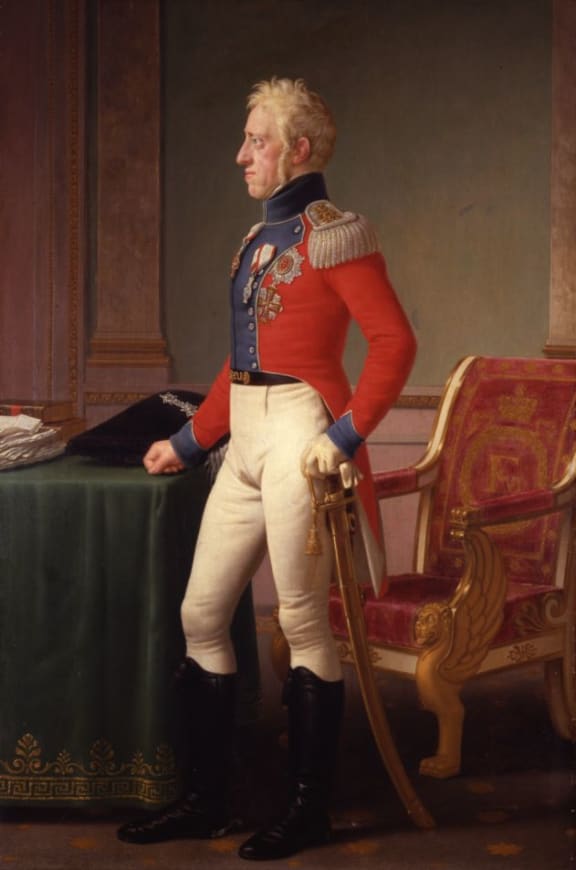 Portrait of king Frederik IV by 19th century painter C W Eckersberg. The King is dressed in a uniform standing by a table with documents, the king is now shown as the principal servant of the bureaucratic state