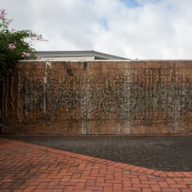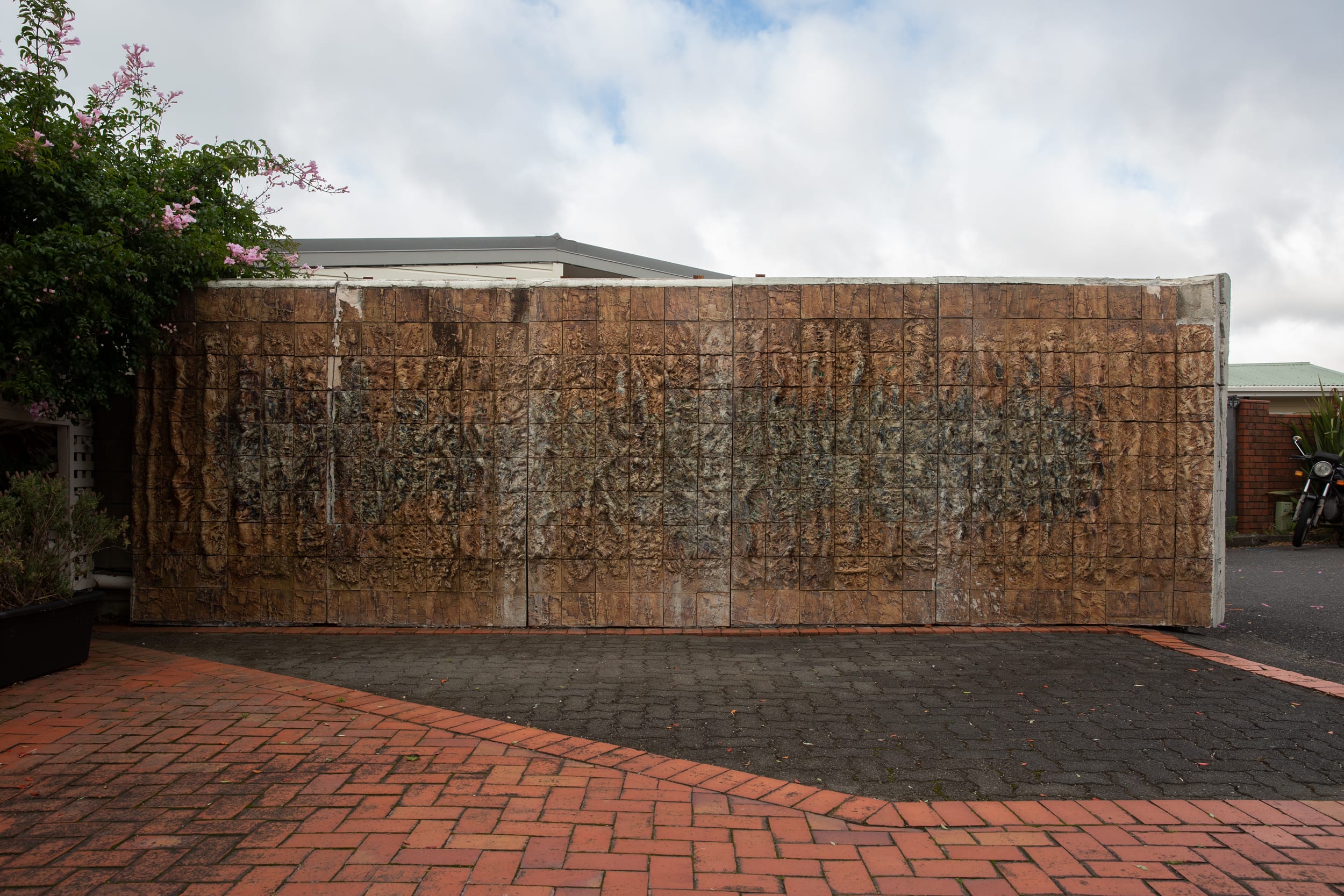 Doreen Blumhardt ceramic wall reinstalled after the demolition of the First Church of Christ Scientist, Khandallah, Wellington, February, 2023 (PHOTO: Simon Devitt)