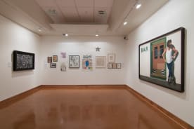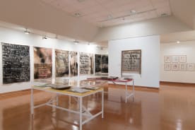 Freefall, exhibition installation view, featuring Colin McCahon, Preliminary study for University of Otago Library mural. Numbers theme, 1966; posters, poems and Robin White Sam Hunt at the Portobello Pub, 1978. Courtesy of Hocken Collections - Te Uare Taoka o Hākena, University of Otago. Photo: Iain Frengley.