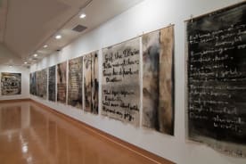 Freefall, exhibition installation view, featuring Colin McCahon, The Wake, 1958. Ralph Hotere, And ye shall dwell in the land I gave your fathers and ye shall be my people and I will be your God. Ezekiel, 36. 28, 1983, image reproduction by permission of the Hotere Foundation Trust; and Joanna Paul, The Stillness of the Rose (i-vii), 1994. Courtesy of Hocken Collections - Te Uare Taoka o Hākena, University of Otago. Photo: Iain Frengley.