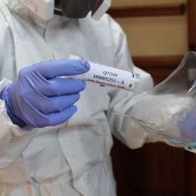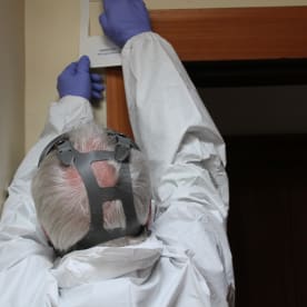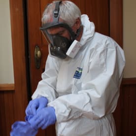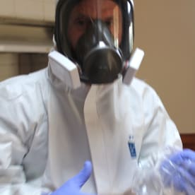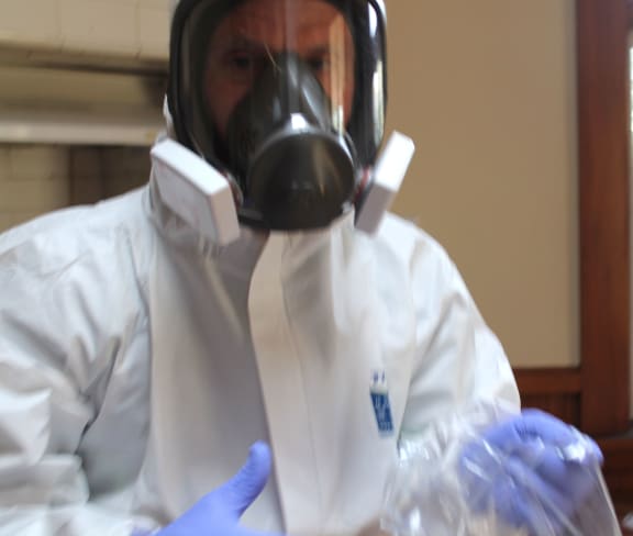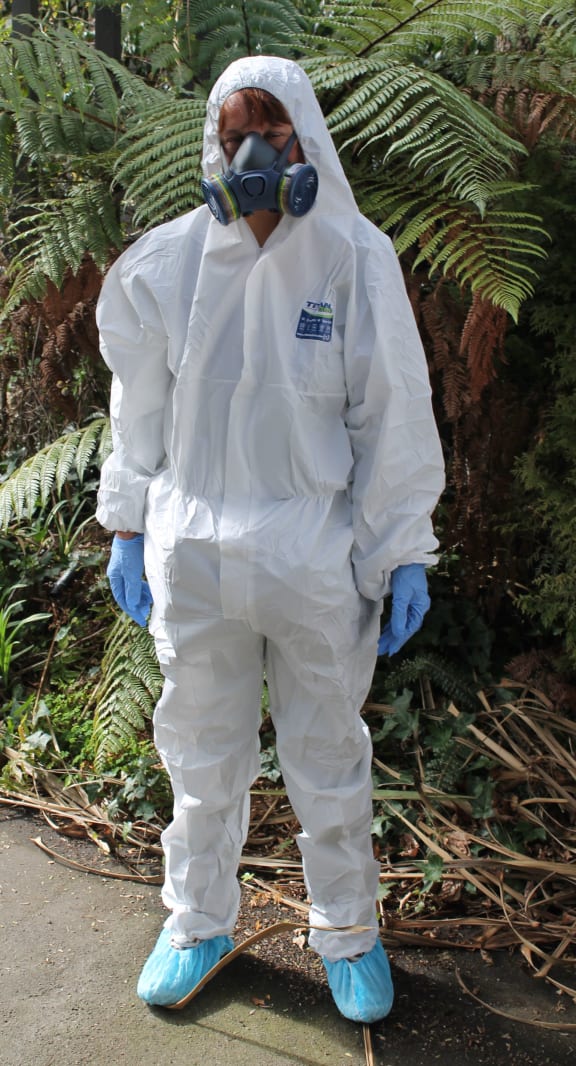 He wears protective clothing, gloves and mask. Suits and gloves are disposed of afterwards.