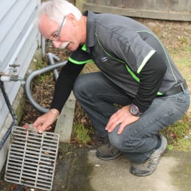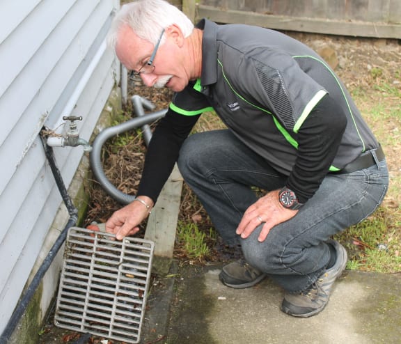Graeme Martin begins his inspection with a look around the property, checking drains for signs of corrosion, often associated with meth manufacture.
