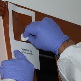 By swabbing within the 100 square centimetre stencil area, he collects a sample that corresponds to Ministry of Health guidelines.